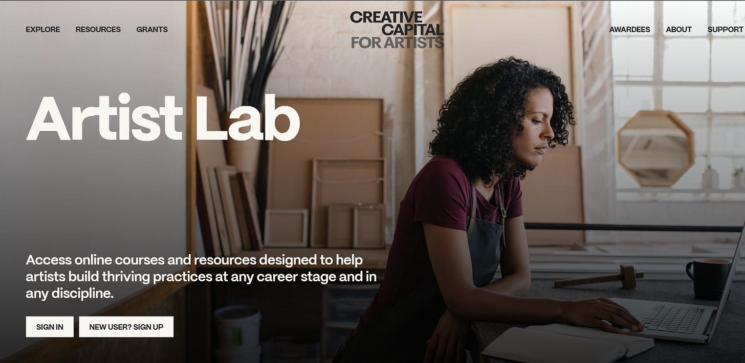 Image is a screenshot from the Creative Capital for Artists resource page, titled Artist Lab, and features headings, an image of a person with dark curly hair and a dark tshirt looking at a laptop, and information to access the online courses and resources for artists.