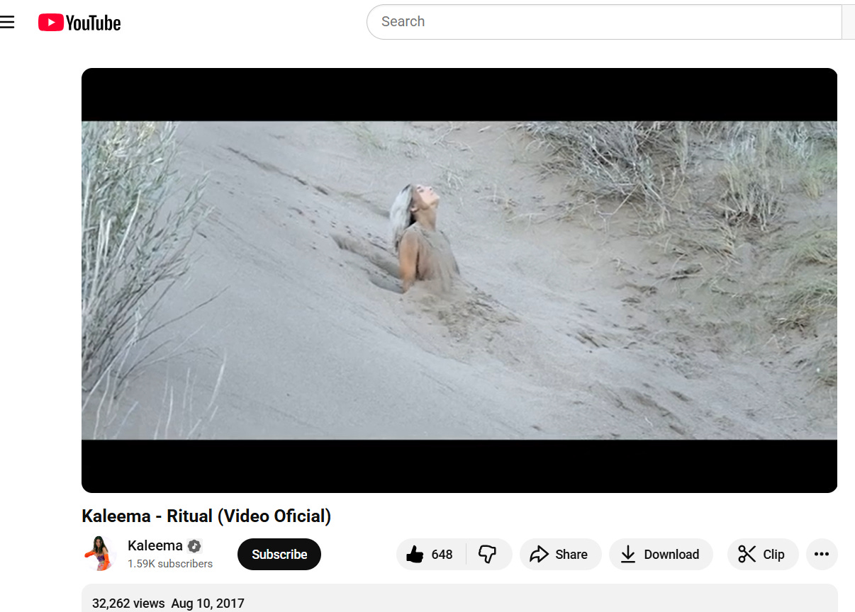 Image is a screenshot of Kaleema rising from the sand in the music video for “Ritual”.