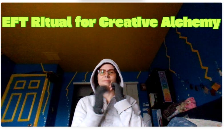 Image is a screenshot of Merrick’s EFT Ritual for Creative Alchemy with the title across the top in a blue bubbly font, and they’re wearing a heathered light gray hoodie with gray gloves.